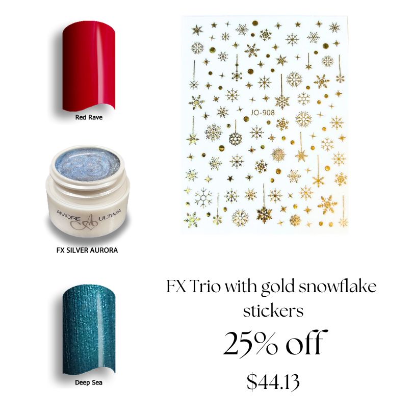 FX Red Rave, Deep Sea, and Silver Aurora make this beautiful trio. Just in time for Christmas. Bonus gold Christmas snowflake stickers also included.