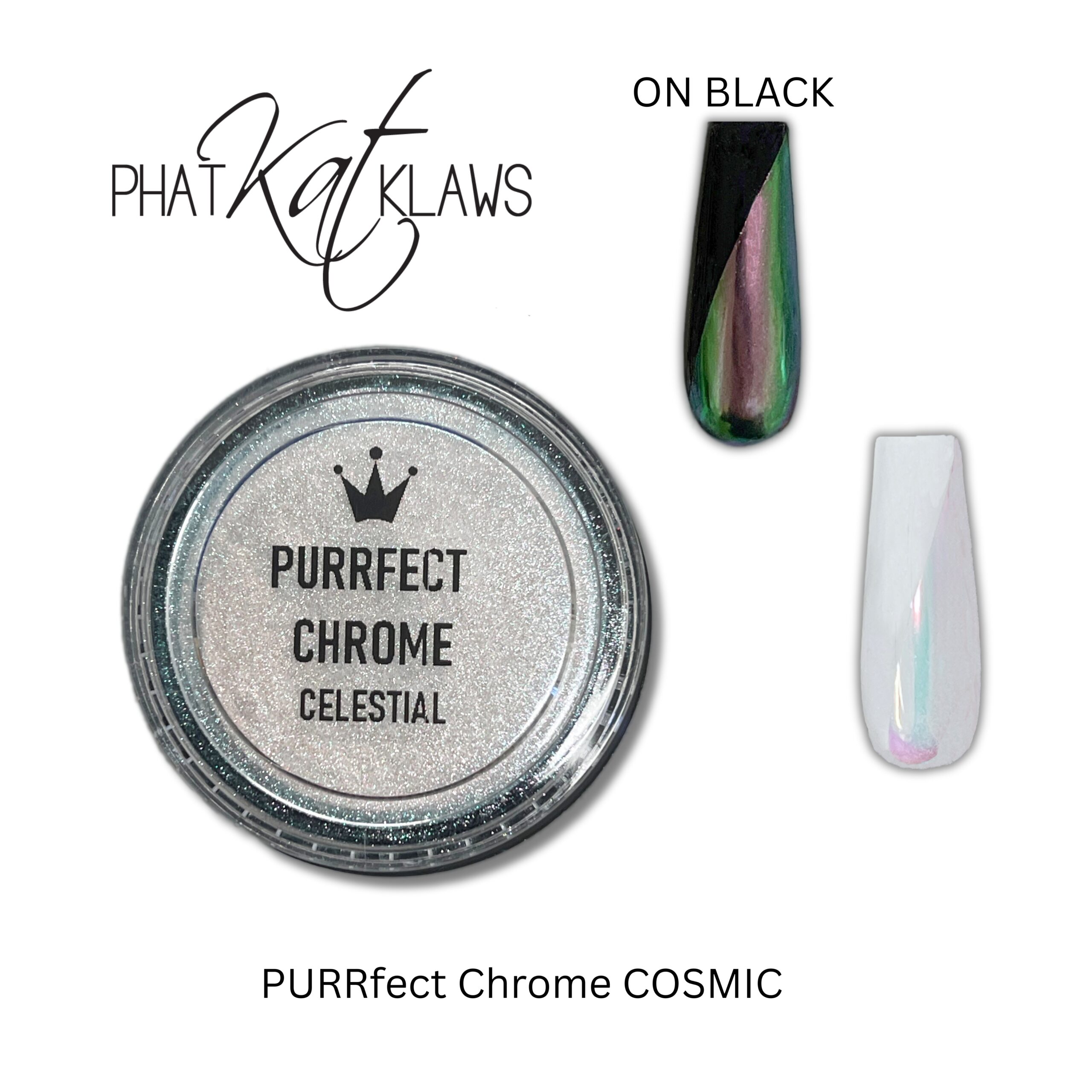 Phat Kat Purr-Fect color shifting chromes apply beautifully over color or plain finished nail to add a gorgeous color shifting finish to your nails that's out of this world.
