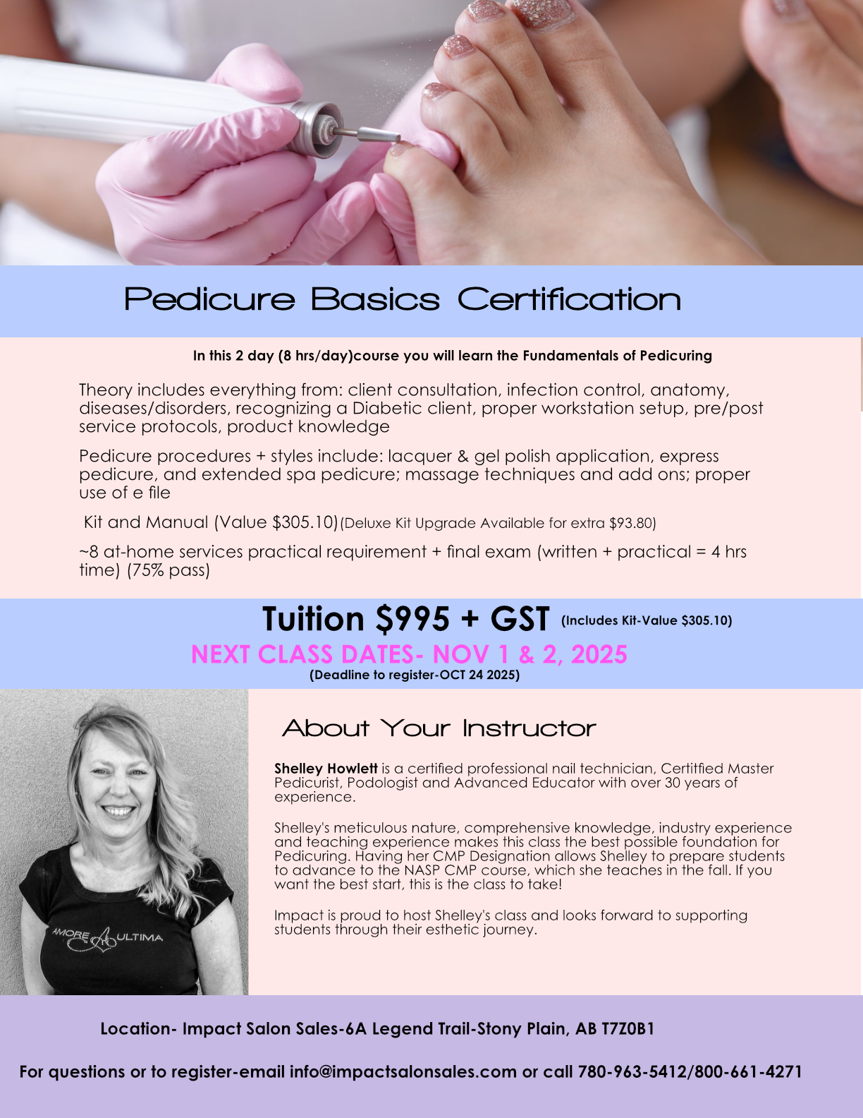 Register-Pedicure Basics Nov 1& 2, 2025 Expand your service menu and increase your earning capacity by becoming a Certified PedicuristCLASS DATES NOV 1& 2, 2025DEADLINE TO REGISTER OCT 24, 2025 PLEASE FILL OUT THE CONTACT FORM BELOW FOR MORE INFORMATION, CLASS OUTLINE ETC. DEADLINE TO REGISTER IS OCTOBER 24, 2025 Name Email I am interested in more information on the Pedicure Class Please! Send